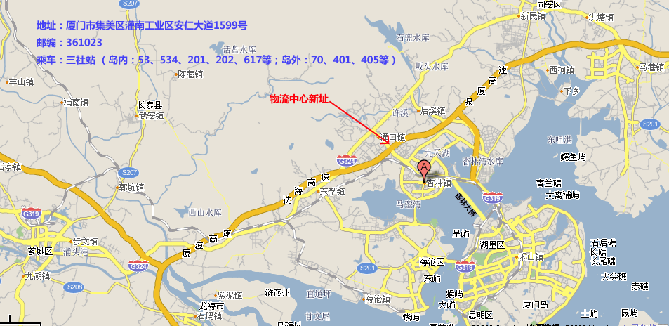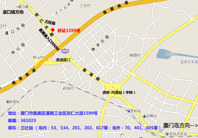 新址乘車:安仁大道—三社站(工業(yè)區(qū)路口)下車即可(島內(nèi):可乘坐53、534、201、202、617公交車;島外可乘坐70、401、405公交車),位置示意圖如下: