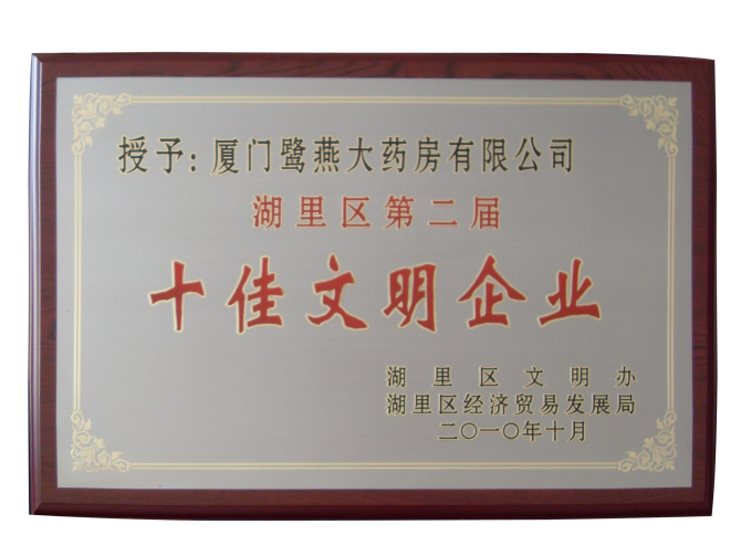 廈門鷺燕大藥房有限公司于2010年10月被廈門市湖里區(qū)文明辦、廈門市湖里區(qū)經(jīng)濟(jì)貿(mào)易發(fā)展局評(píng)為湖里區(qū)第二屆“十佳文明企業(yè)“榮譽(yù)稱號(hào)。