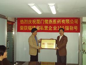 由福建省私營(yíng)企業(yè)協(xié)會(huì)、福建日?qǐng)?bào)社聯(lián)合開(kāi)展的2005年度“福建省私營(yíng)企業(yè)100強(qiáng)”評(píng)定活動(dòng),于近日揭曉最終入圍企業(yè),廈門(mén)鷺燕醫(yī)藥有限公司榜上有名。今天,市工商局的領(lǐng)導(dǎo)來(lái)我司進(jìn)行了授牌儀式。儀式上,吳金祥總裁向領(lǐng)導(dǎo)們介紹了鷺燕的成長(zhǎng)歷程,并對(duì)將來(lái)的經(jīng)營(yíng)進(jìn)行了展望。領(lǐng)導(dǎo)們?cè)诼?tīng)取了吳總裁的匯報(bào)后,肯定了鷺燕的發(fā)展模式,同時(shí),也對(duì)鷺燕的可持續(xù)發(fā)展提出了許多有益的建議。